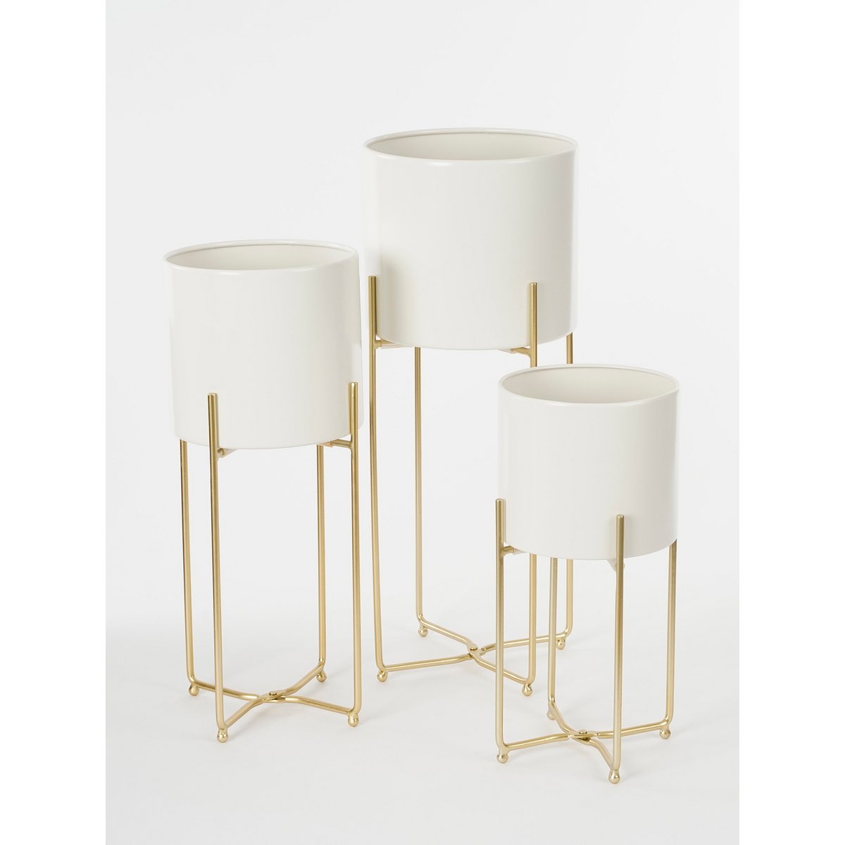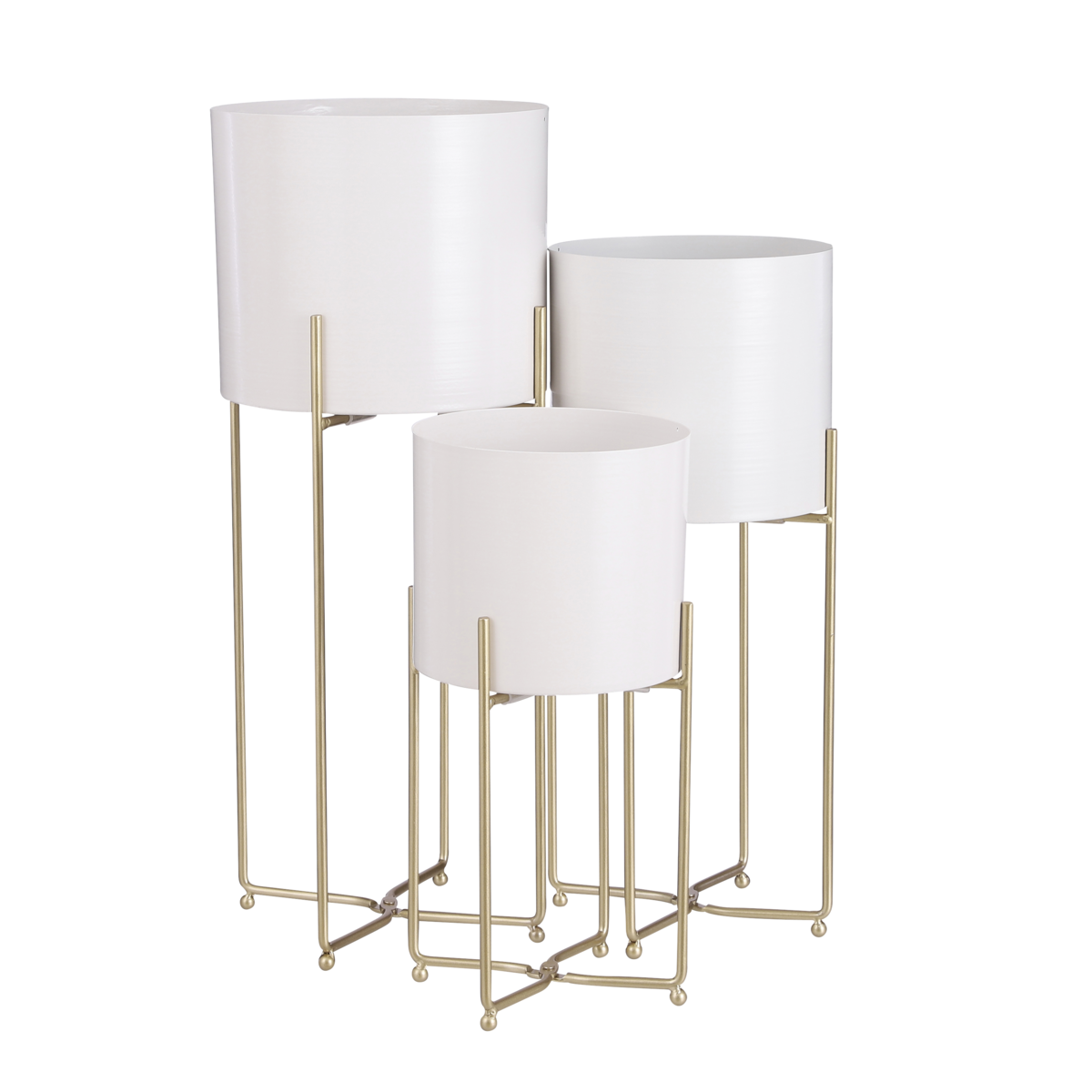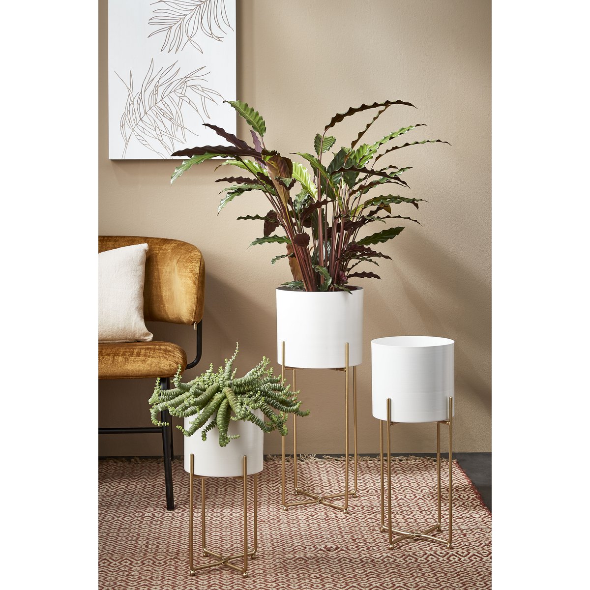 Creëer een leuk plantenhoekje in huis met deze drie Aries bloempotten van Mica Decorations. De potten staan op een standaard, waardoor elke plant net wat hoger uitkomt. De potten zijn gemaakt van metaal en hebben een neutrale, witte kleur. Mooi voor in elk interieur! De goudkleurige standaards geven hier een chique draai aan. Doordat de potten verschillende afmetingen hebben, kun je leuk op verschillende niveaus een plant zetten. Van groot naar klein meten de bloempotten op standaards H58 x Ø24 cm, H49 x Ø21 cm en H38 x Ø19 cm.