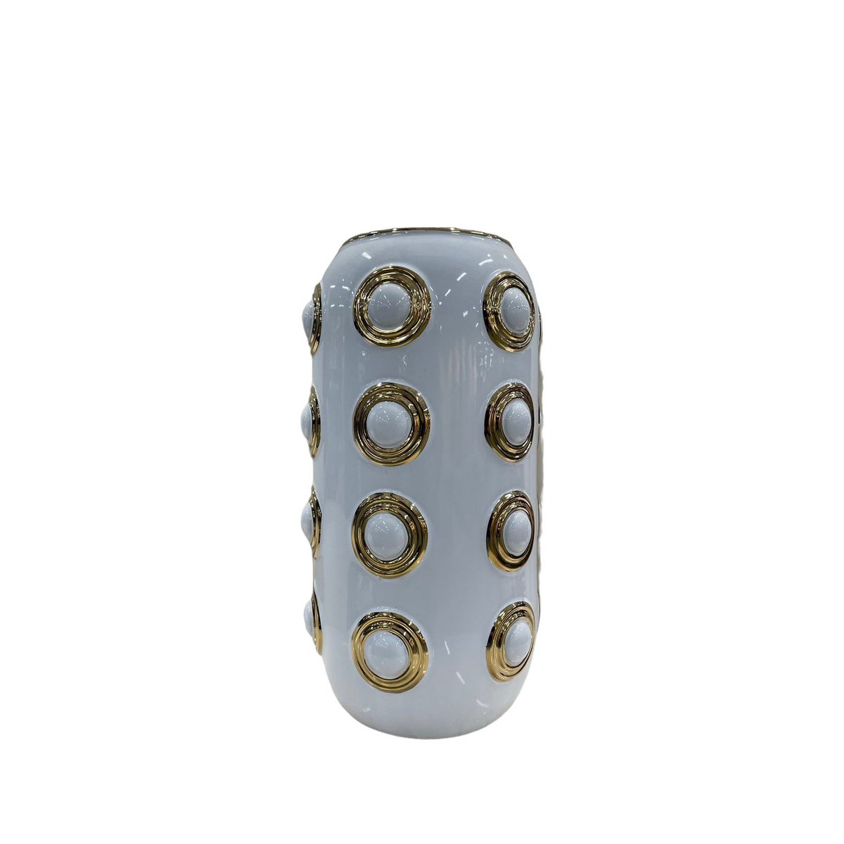 De prachtige Golden Circle Vaas in modern wit en goud staat fantastisch op een stijlvol dressoir of boven een mooie open haard in je huis.