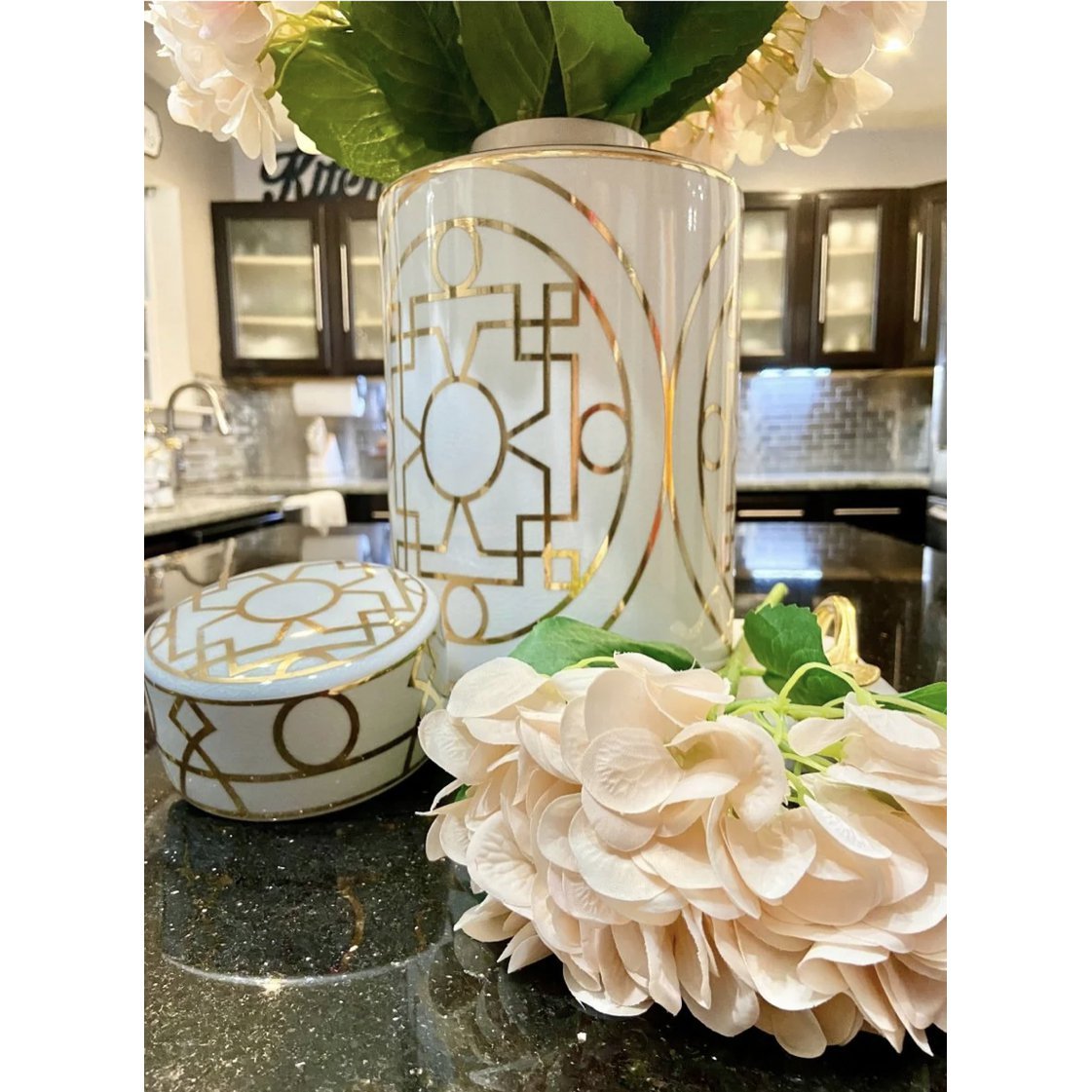 Deze Noble-bussen vormen een elegant decoratief accent voor elk huis. Wit geglazuurde porseleinen bussen zijn voorzien van een metallic goud geometrisch patroon, wat visueel belang aan het decor toevoegt.