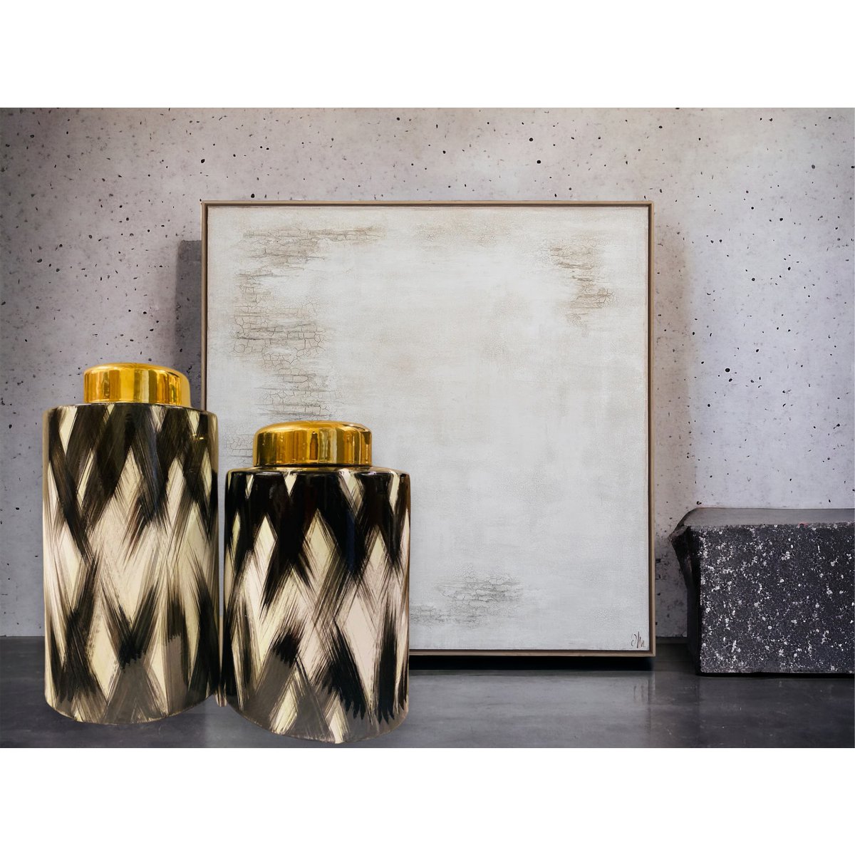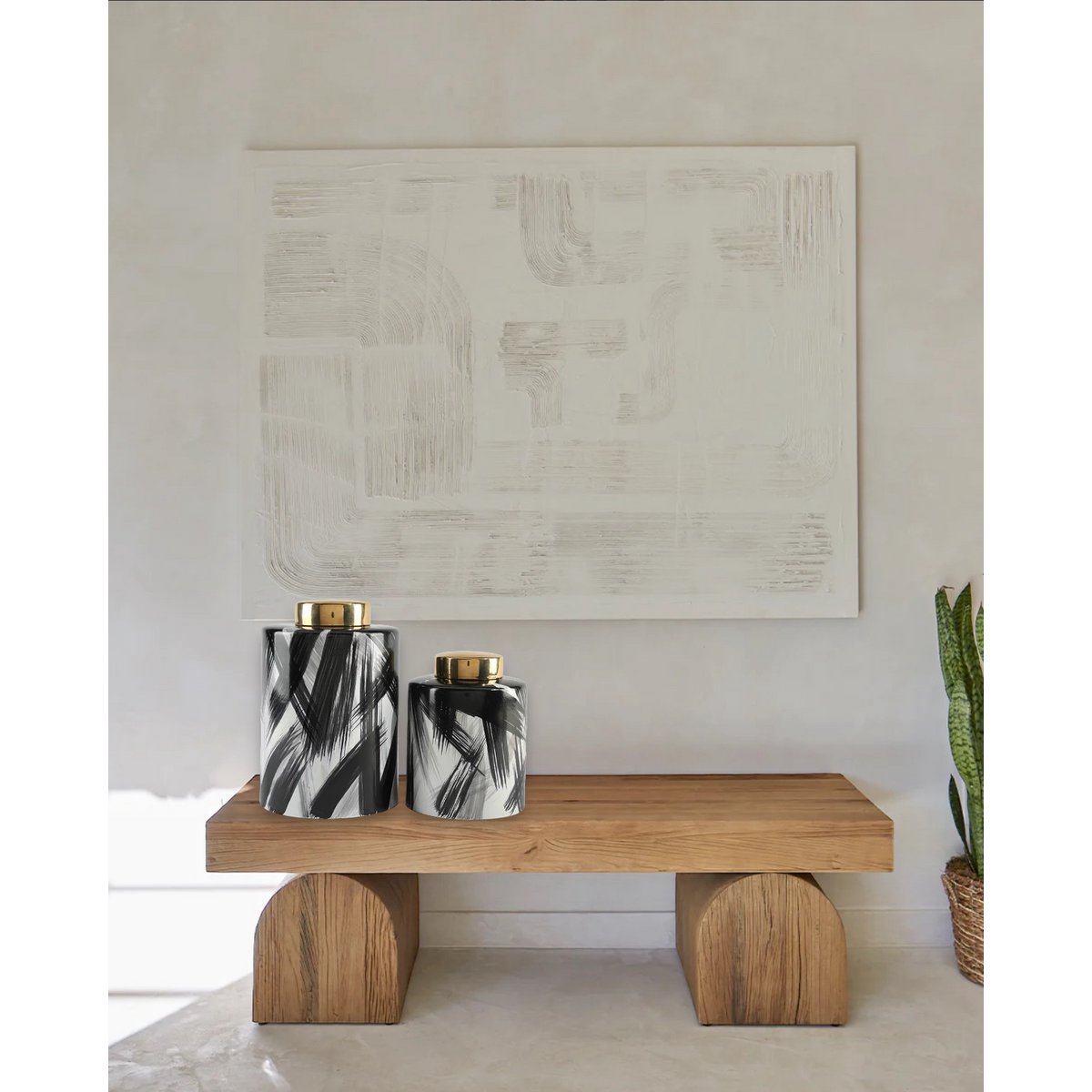 Deze grote, op abstracte kunst geïnspireerde container is een mooie aanvulling op stijlvolle opbergoplossingen. Eigentijds wit en opvallende zwarte kleuraccenten maken deze keramische charmeur ideaal voor een zeer moderne woonkamer of familiekamer.