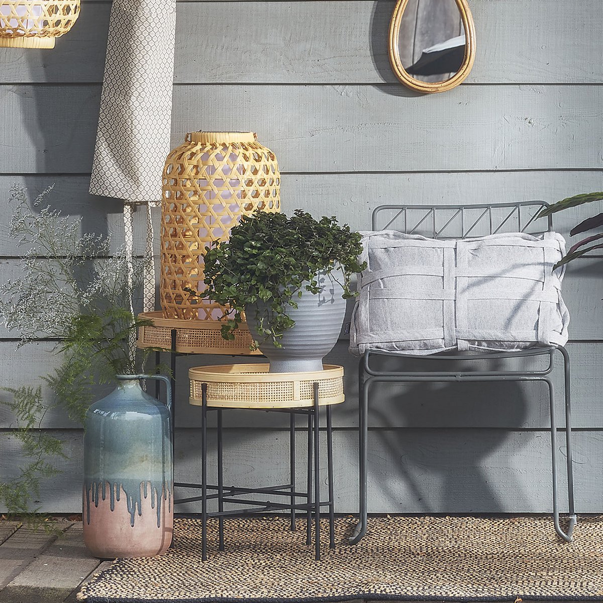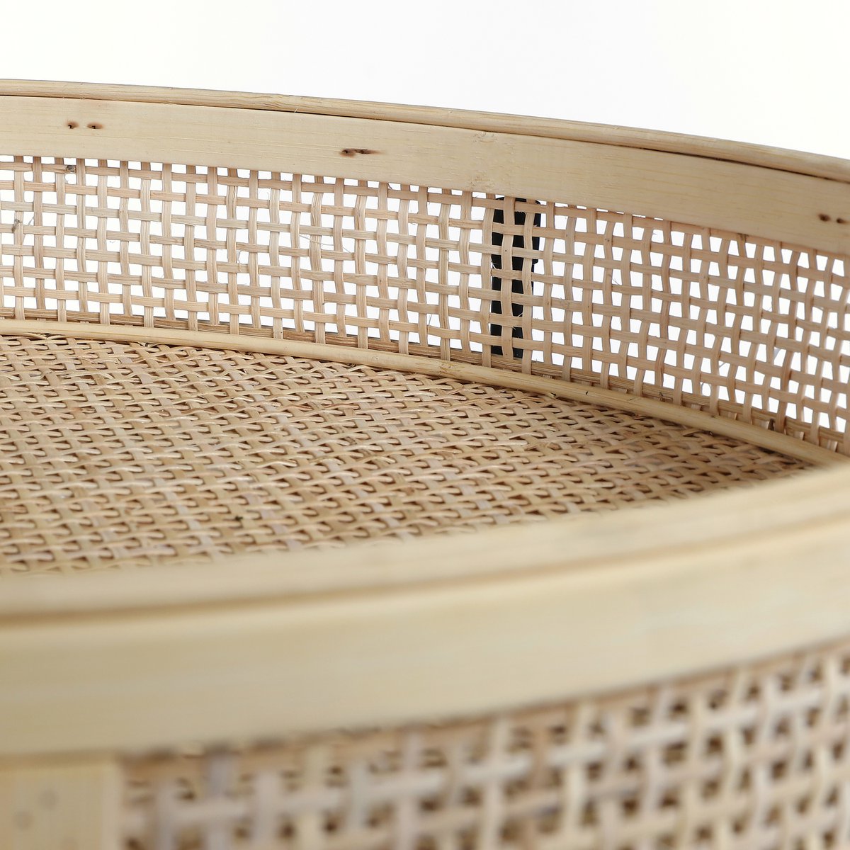 Op zoek naar een leuke bijzettafel voor op het terras of balkon? De Leandro tuintafeltjes van Mica Decorations passen door de neutrale uitstraling overal bij. Het frame is gemaakt van zwart metaal en biedt ondersteuning aan een rond blad van bamboe en rotan. Een mooie combinatie! Door de hoge rand kun je alles daarnaast veilig neerzetten, bijvoorbeeld een paar drankjes of wat leuke decoraties. De set bestaat uit twee tafeltjes die je precies onder elkaar kunt schuiven. Zo kun je, als het nodig is, van alles erop kwijt. De afmetingen van de ronde bijzettafels zijn H42,5 x Ø35 cm en H53 x Ø45 cm.