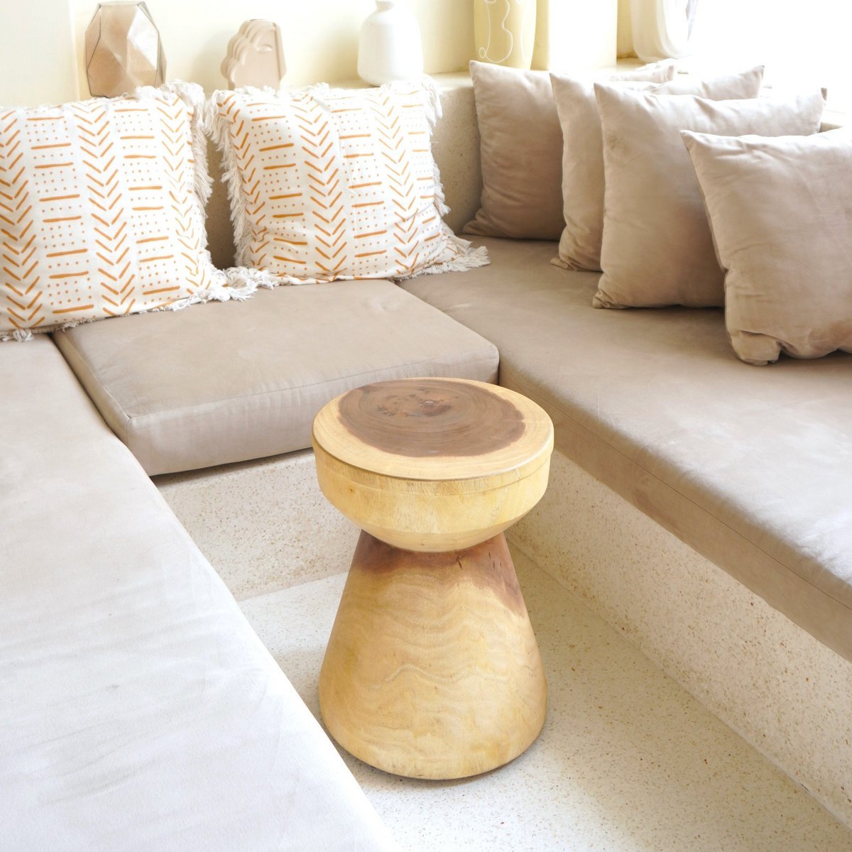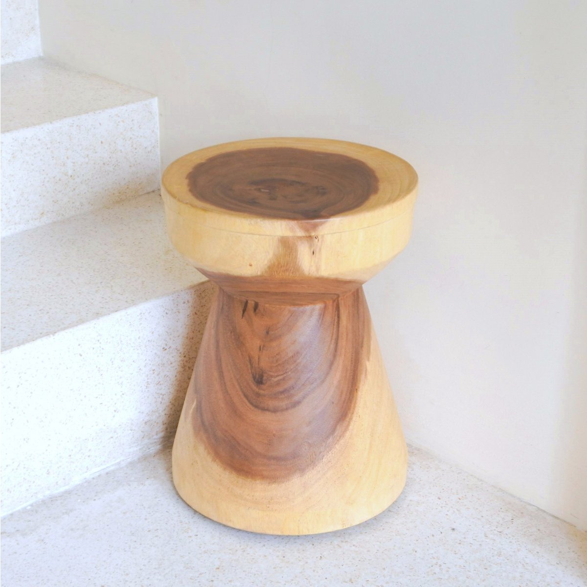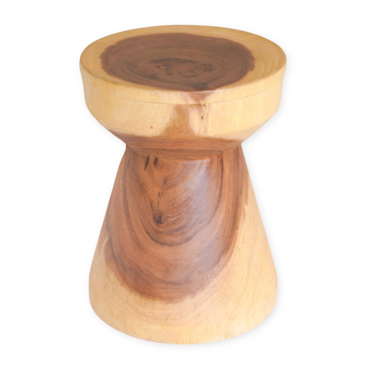 Onze Manado bijzettafel is met de hand gedraaid uit één stuk regenboomhout. De keuze voor dit specifieke hout komt tot uiting in de fascinerende, contrasterende licht- en donkergekleurde nerven, die per stuk uniek variëren. Door de solide, hoogwaardige constructie van Manado gebruik je hem niet alleen als bijzettafel, maar ook als stevige kruk.