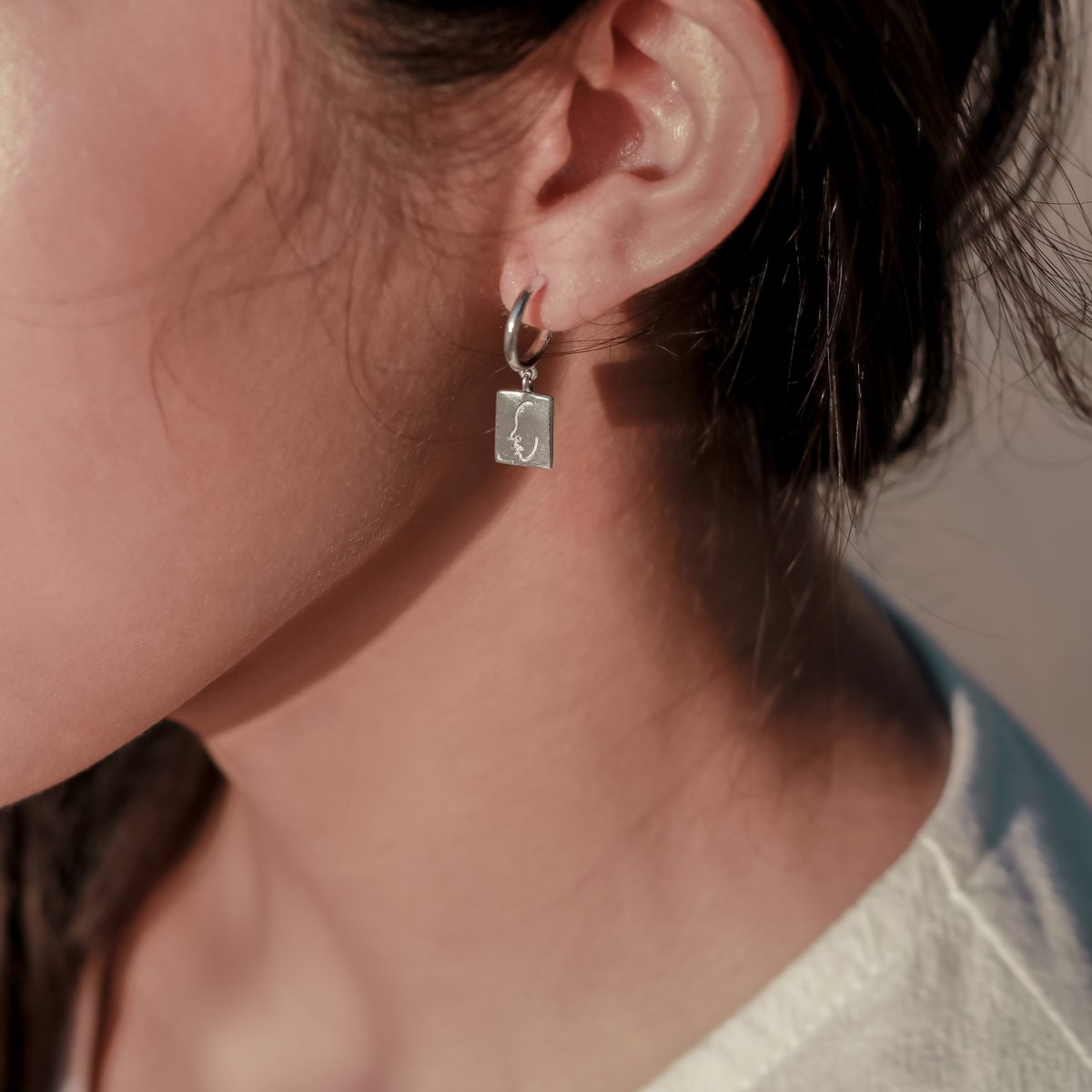 Ze bestaan uit een creoolvormige, ronde oorbel en de rechthoekige hanger. Ze worden gesloten met een vlindersluiting.