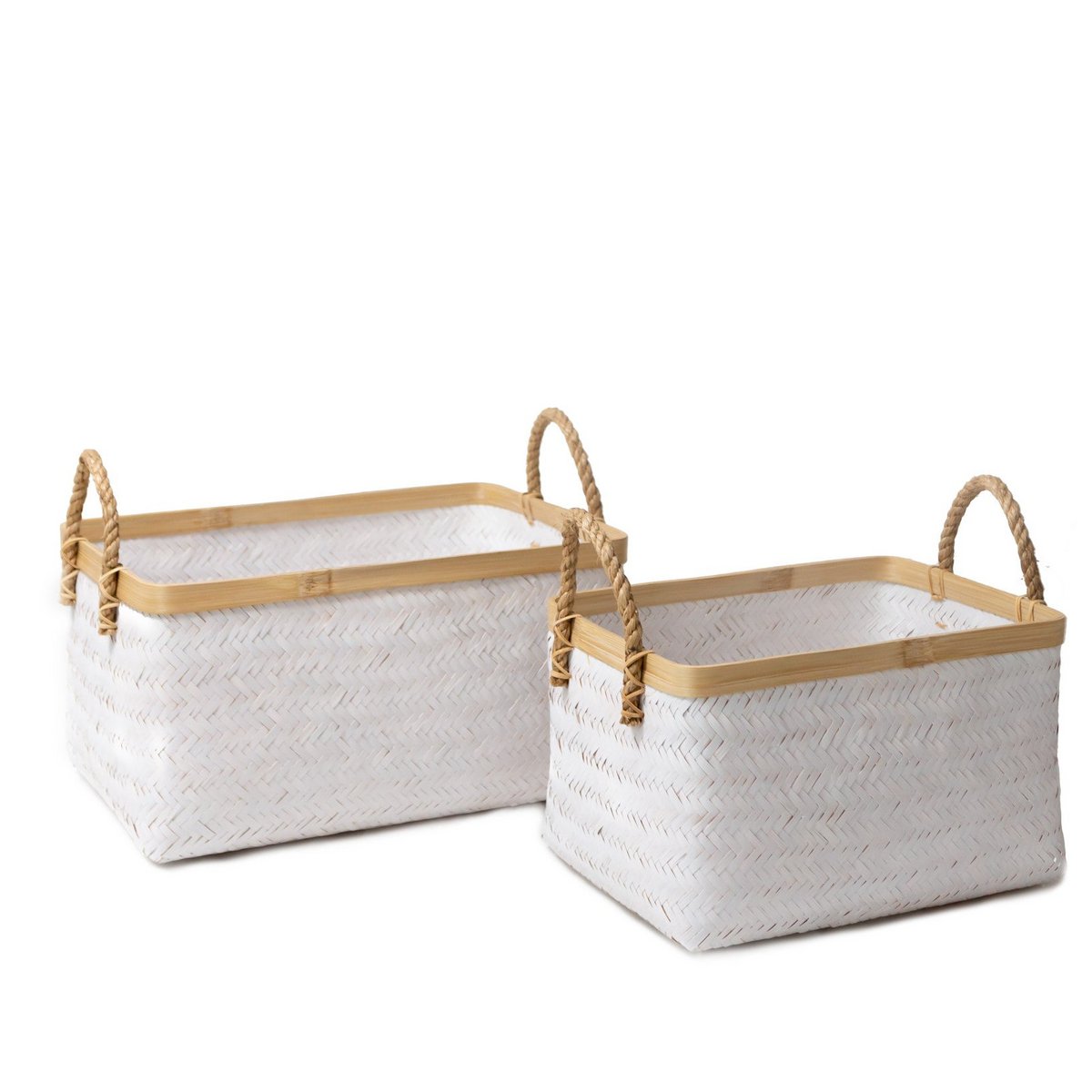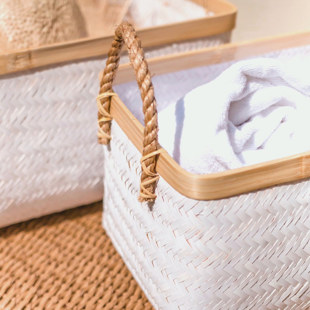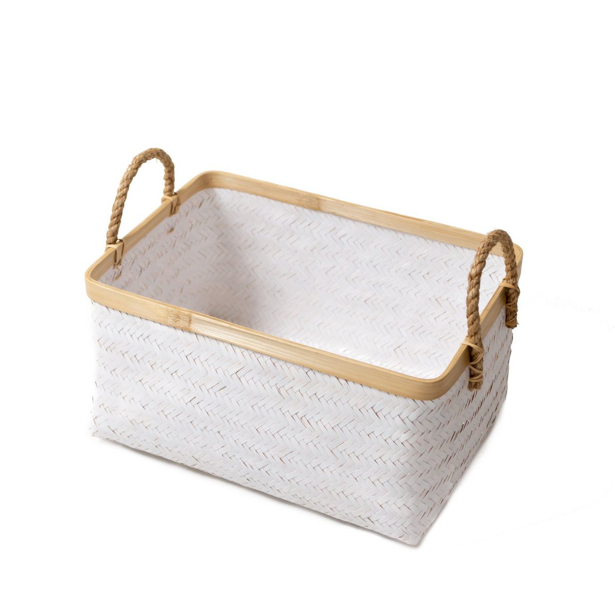 De mand Vaya is verkrijgbaar in twee maten en is met de hand gemaakt van witgekleurd bamboe en maakt indruk door zijn ondoorzichtige geweven look. Het natuurlijke materiaal creëert ondanks het lichte gewicht een stabiele structuur, waardoor het veelzijdig en geschikt is voor zwaardere belastingen.
