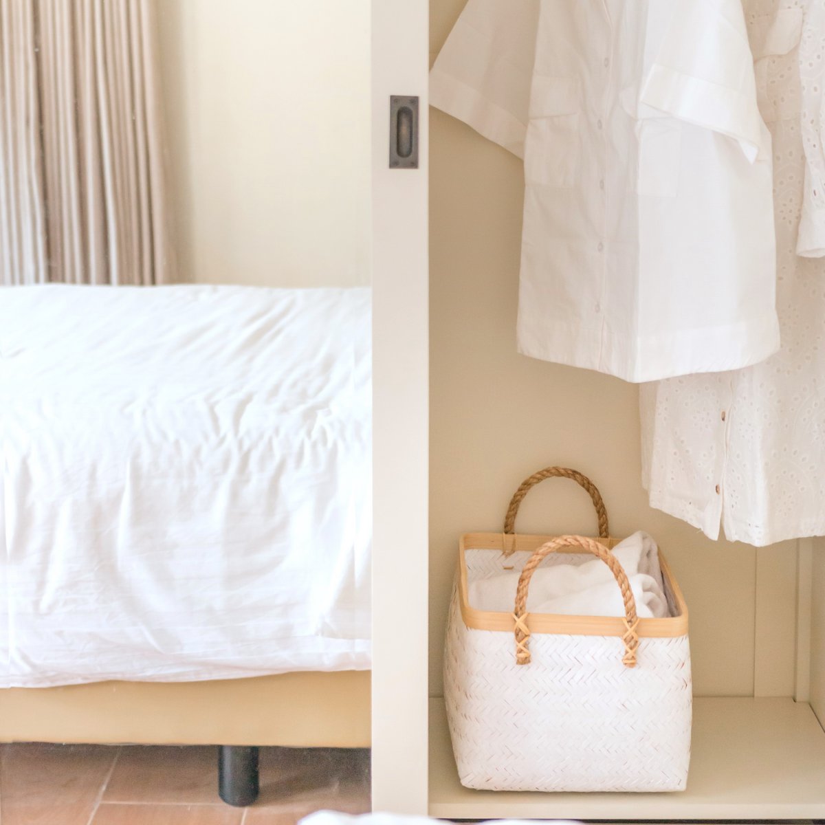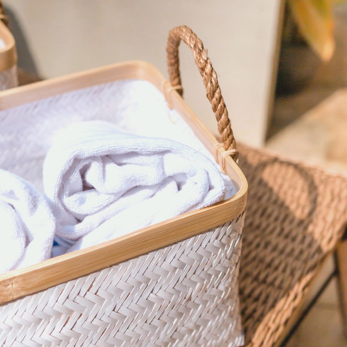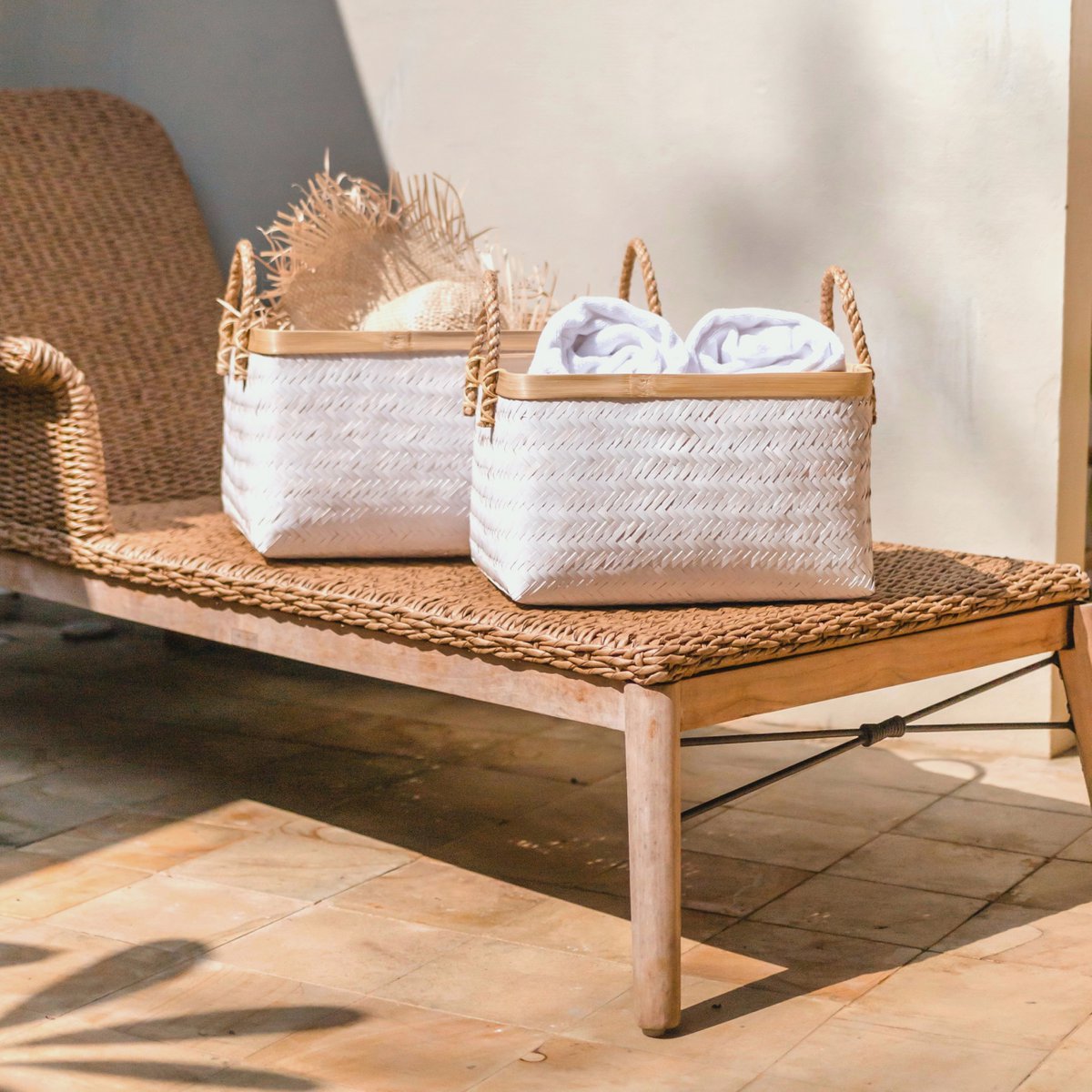 De mand Vaya is verkrijgbaar in twee maten en is met de hand gemaakt van witgekleurd bamboe en maakt indruk door zijn ondoorzichtige geweven look. Het natuurlijke materiaal creëert ondanks het lichte gewicht een stabiele structuur, waardoor het veelzijdig en geschikt is voor zwaardere belastingen.