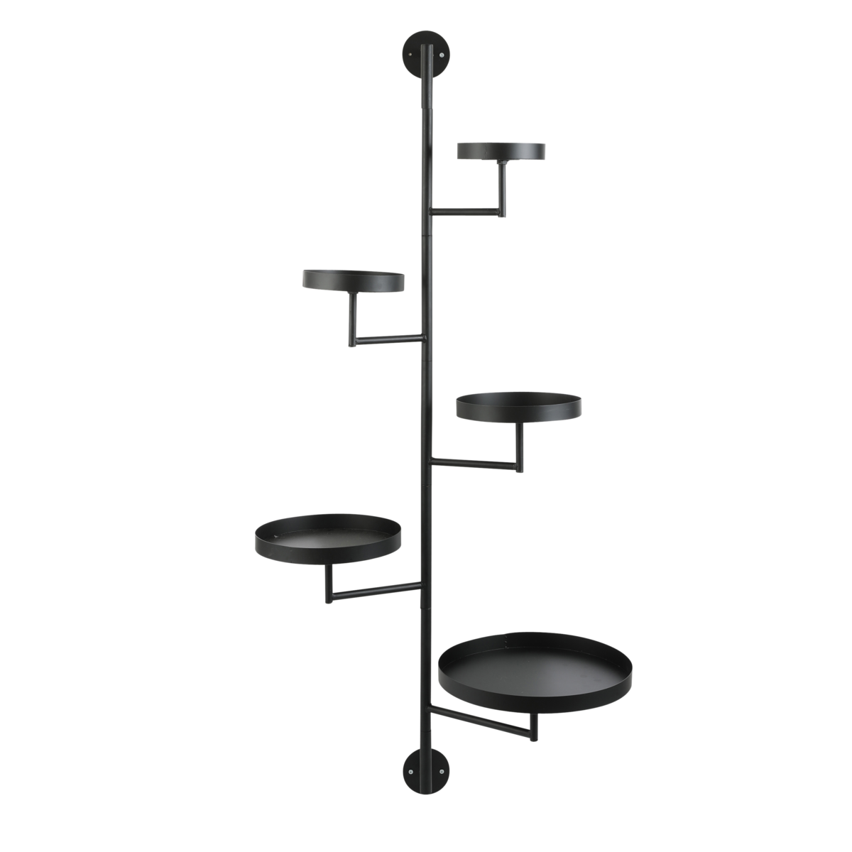 Met dit Perry wandrek van Mica Decorations presenteer je jouw favoriete decoraties op een unieke manier. Geen rechte planken, maar ronde plateaus die direct de aandacht trekken. Leuk voor wat planten, hang hem in de keuken met wat servies erop, of maak er een sfeervol hoekje van met verschillende theelichthouders. Door het zwarte metaal krijgt het rek een stoere touch dat past in elk interieur. Wat zet jij erop? De afmetingen zijn L36 x B30 x H120 cm.