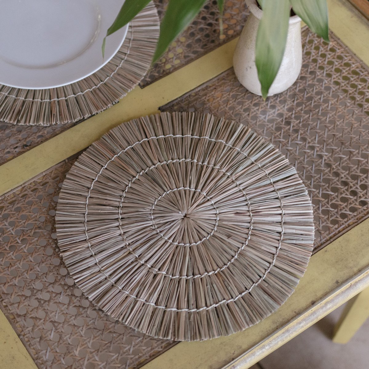 Tijdens het productieproces van onze ronde Alang placemats wordt zeegrasvezel voor zeegrasvezels op stralende wijze met elkaar verbonden totdat er een prachtige, unieke placemat ontstaat. Of het nu buiten is voor een barbecue of binnen voor een familiemaaltijd samen, Alang brengt een echt vakantiegevoel op tafel.