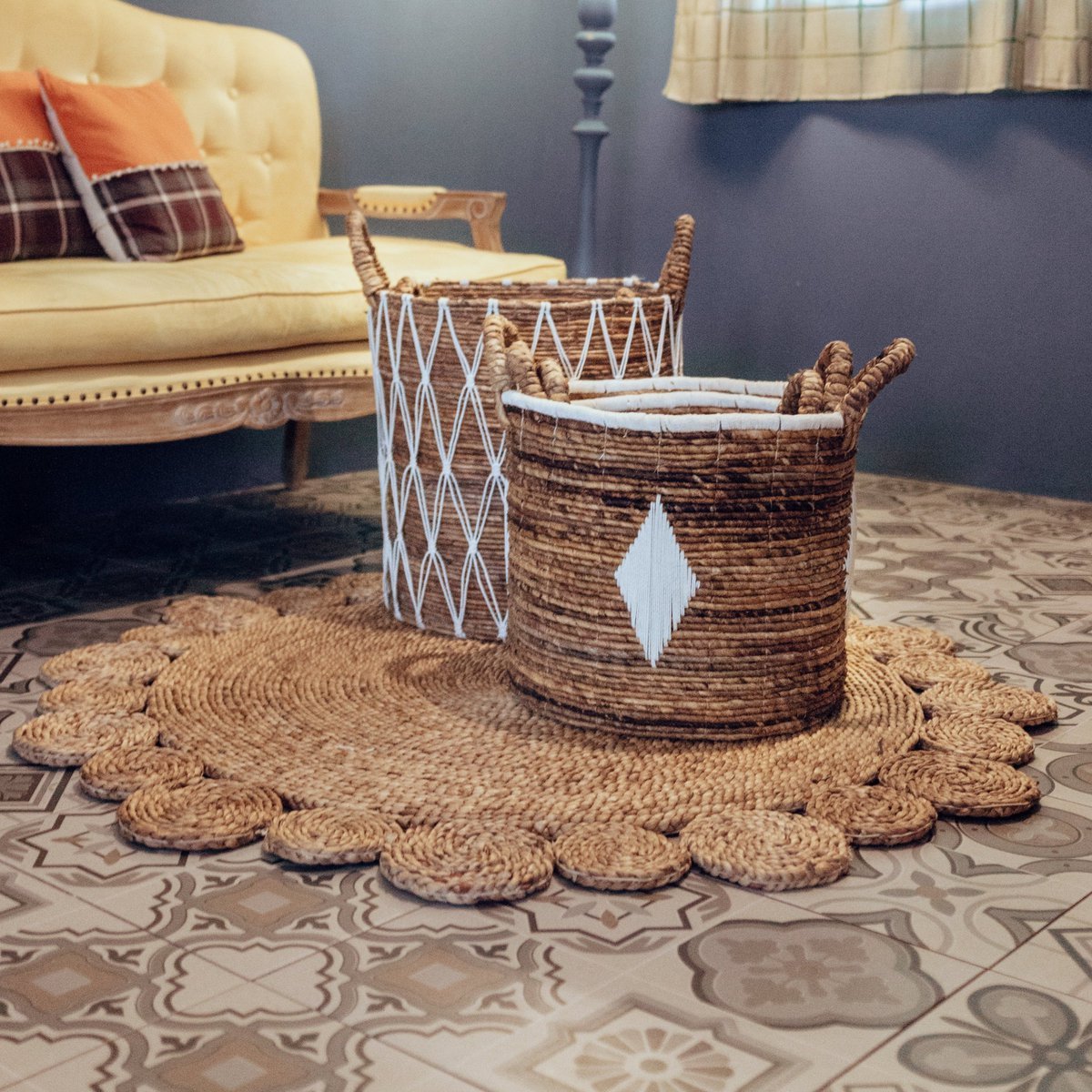 Ons kleine ronde vloerkleed Laora is geweven van de tropische plant waterhyacint. Kleinere cirkels zijn gegroepeerd rond een grote centrale cirkel. Met zijn bijzondere geometrische vormgeving is het een natuurlijk decoratief element in elk huis dat een huiselijke sfeer creëert.