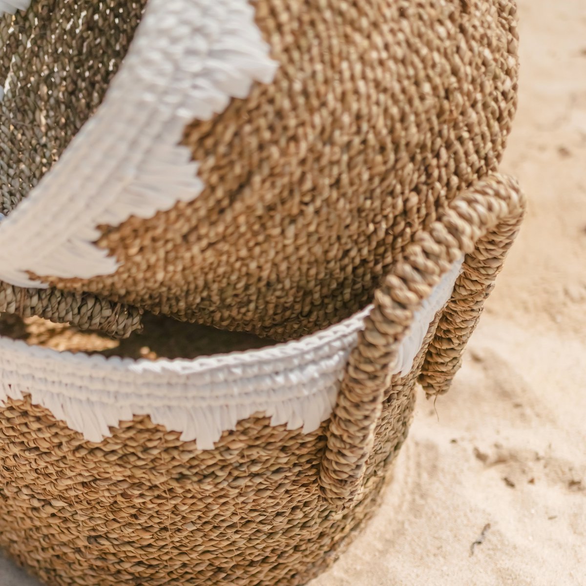 Ronde manden van zeegras met witte katoenen koorden WAIGEO (3 maten) Decoratieve was- of opbergmand