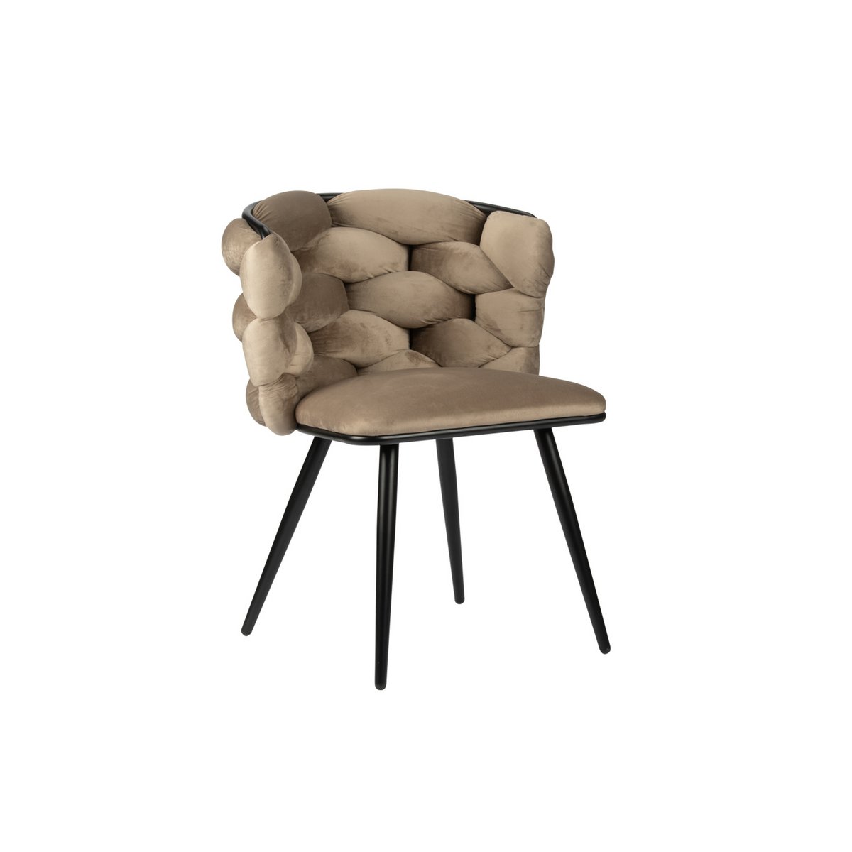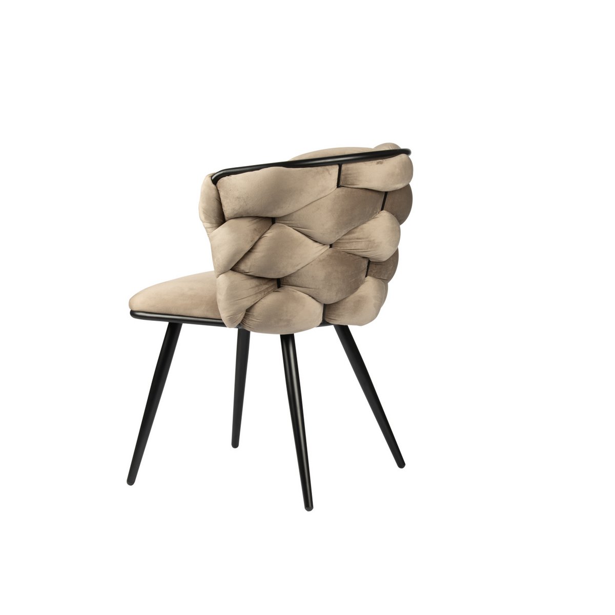 De Rock chair is vernoemd naar het prachtige weefpatroon in de omringende rugleuning. Deze stoel is een moderne luxe eyecatcher in uw interieur, een opvallende verschijning met een uniek design dat zeker een gesprek op gang brengt onder uw dinergasten. Hang jij graag lang rond de eettafel, dan is de schommelstoel de perfecte keuze. De Rock chair is verkrijgbaar in zes opvallende kleuren: Sand White (Velvet), Bronze (Felvet), Beige (Chenille), Bruin (Chenille), Terra (Chenille) en Taupe (Chenille). Productafmetingen: Breedte: 60 CM Diepte: 60 CM Hoogte: 77 CM Zithoogte: 48 CM Armhoogte (voorkant): 75 CM Belangrijke informatie: Geschikt voor dropshipping Montage vereist Originele verpakking 2 stuks / 1 doos Niet brandvertragend Productmaterialen: Zitting: frame van multiplex en metaal / schuim 25 kg/m3 / stoffen poten: aluminium met zwarte poedercoating