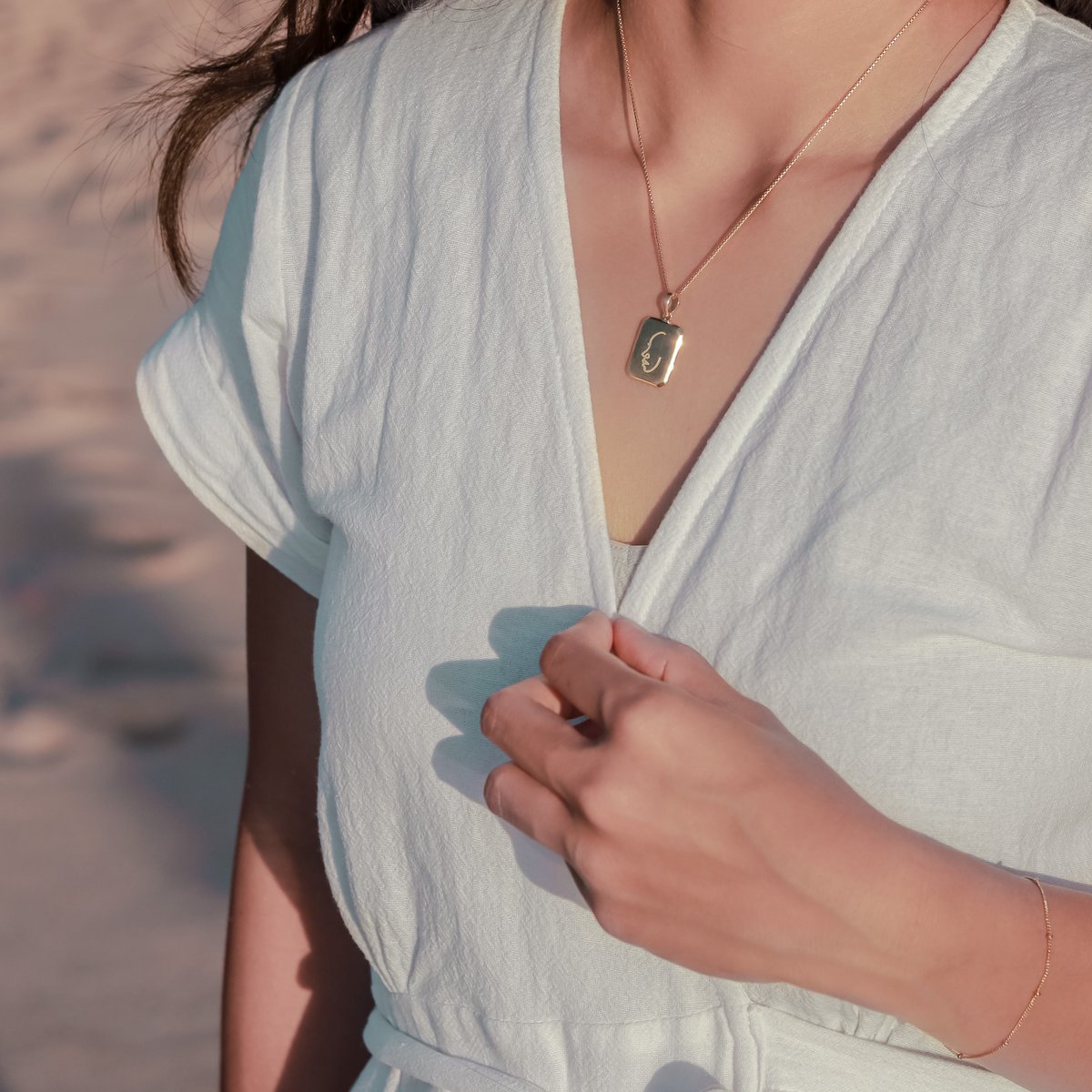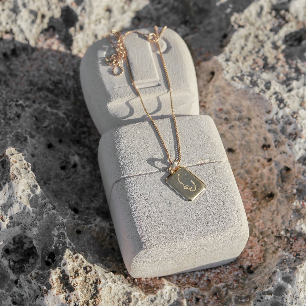 Een liefdevol met de hand vervaardigde hanger met een gegraveerd, abstract gezicht is het middelpunt van deze gouden ketting en maakt het tot het absolute hoogtepunt van je outfit. Omdat de hanger slechts 18k verguld zilver is en geen opvallende edelstenen of andere versieringen heeft, slaat de subtiele ketting een goed figuur, zowel in het dagelijks leven op het werk of tijdens het winkelen als tijdens het uitgaan.