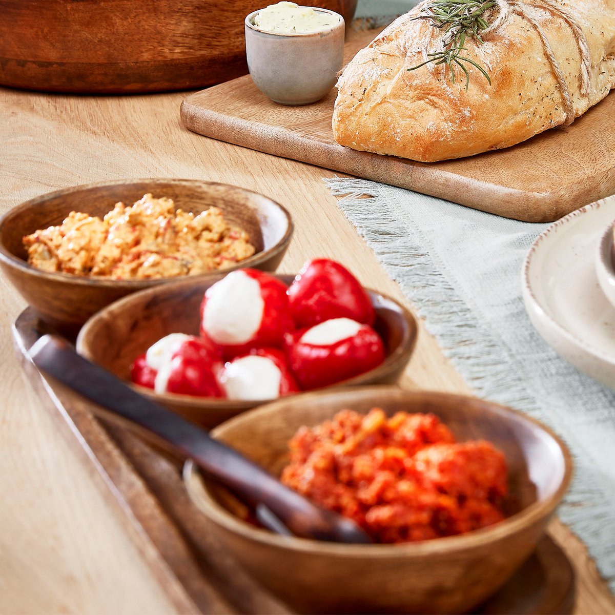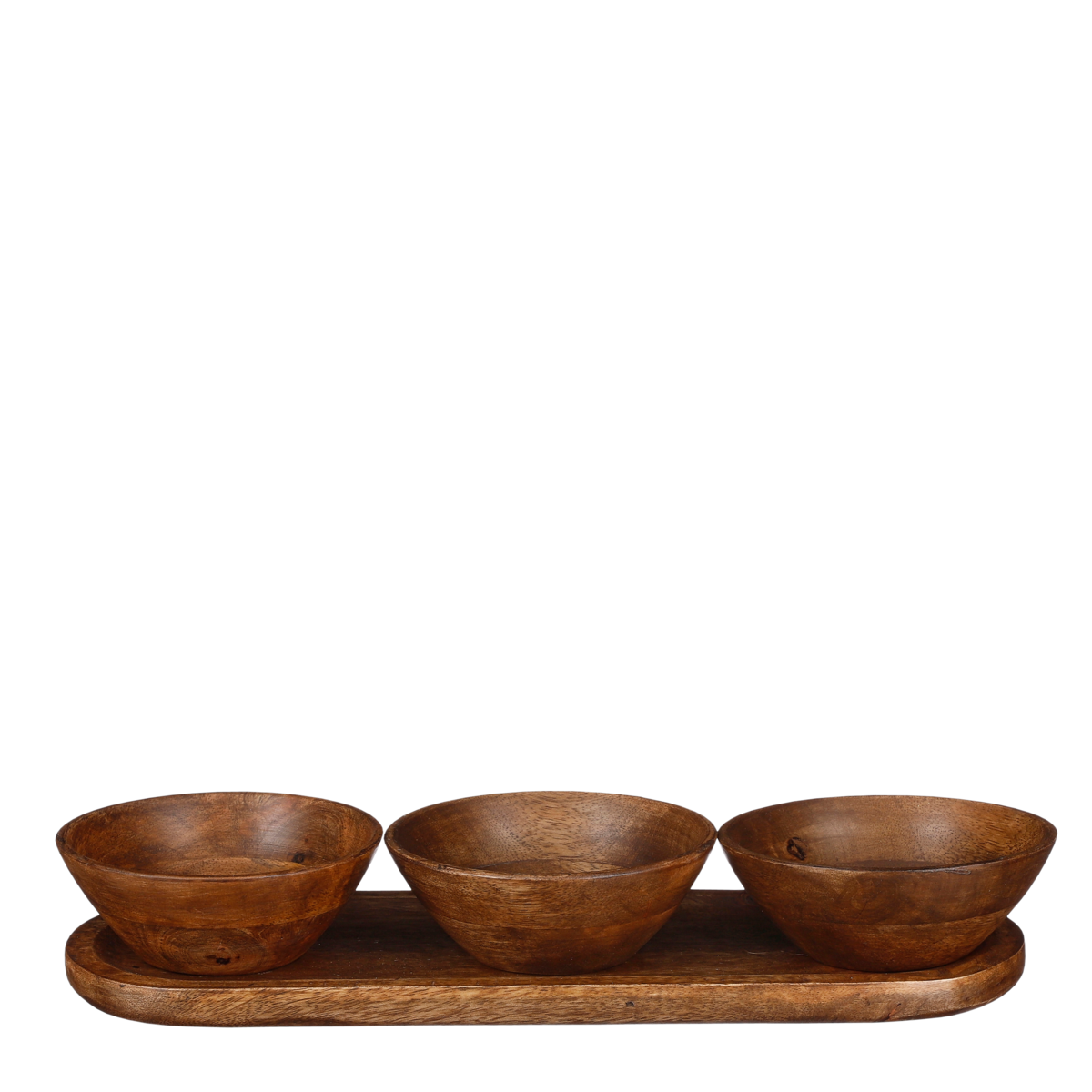 De Tomar schaaltjes met dienblad komen uit de collectie van Mica Decorations en zijn ideaal om hapjes te serveren. De schaaltjes zijn gemaakt van FSC®-gecertificeerd mangohout in een warme, donkerbruine kleur. De schaaltjes worden verkocht als set, drie kleine schaaltjes en een ovaal dienblad. De schaaltjes zijn erg leuk om tapas hapjes te serveren! De afmetingen zijn L36 x B12 x H5 cm. De inhoud is 200 ml per schaaltje.