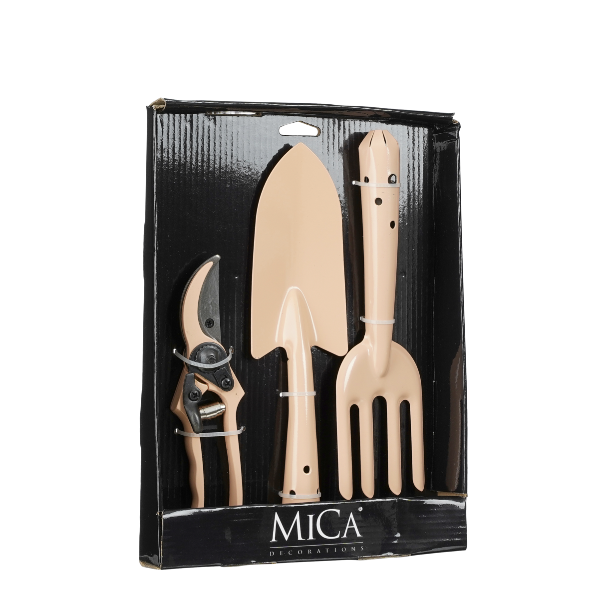 Bij zonnig weer is het ook heerlijk om weer in de tuin te werken, vooral met deze stijlvolle tuingereedschap set van Mica Decorations. De tuingereedschap set is gemaakt van stevig metaal en heeft een prachtige roze kleur. De 3-delige set bestaat uit een snoeischaar, hark en een schep. De snoeischaar is ideaal om takken te knippen, de schep om aarde te verplaatsen en de hark om bladeren te verwijderen en de ondergrond los te harken. De stijlvolle gereedschap voor in de tuin is ook leuk om aan iemand cadeau te geven! De complete tuingereedschap set heeft een afmeting van L23 x B5 x H31 cm.