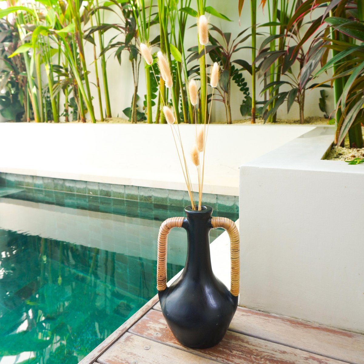 Selayar valt op door zijn bijzondere vorm, die doet denken aan antieke vazen. Met zijn klassieke combinatie van een slanke flessenhals en een bolvormig fleslichaam wordt het zeker een van je favoriete decoratieve accessoires. De zwarte kleur past bij elke interieurstijl en de symmetrische handgrepen aan beide zijden, omwikkeld met rotanvezels, zorgen ervoor dat hij bijzonder harmonieus oogt in je huis.