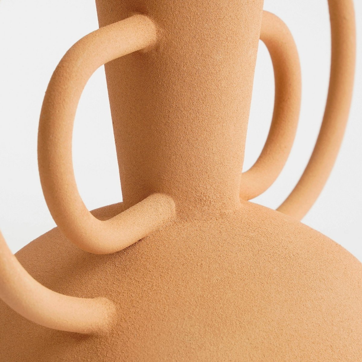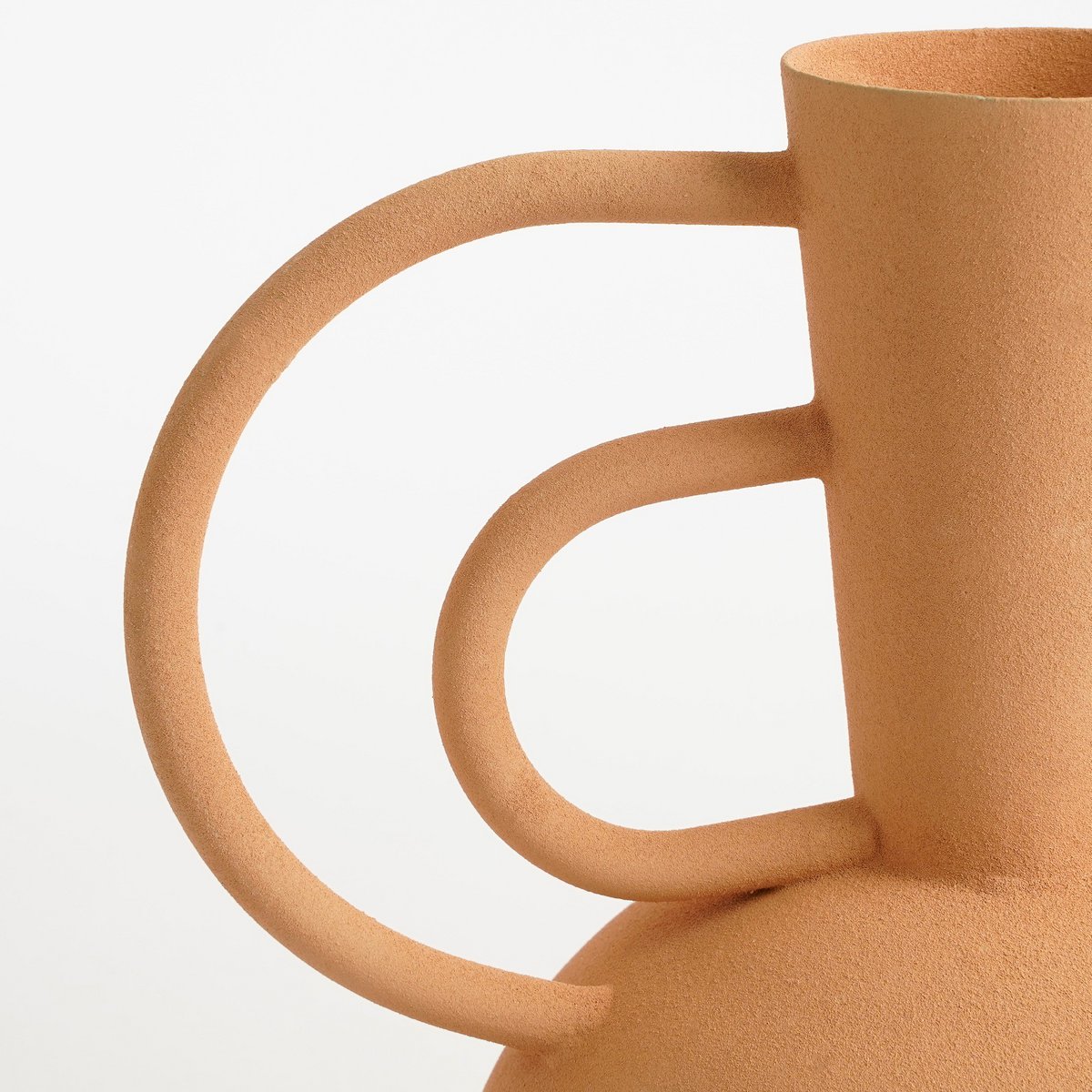 Met deze Vario vaas van Mica Decorations haal je een eyecatcher in huis. De vaas van metaal is afgewerkt in een perzik kleur en heeft een matte, ruwe afwerking. De vaas valt op door de stijlvolle ronde handvaten. Past perfect in een modern interieur! De vaas heeft een smalle opening aan de bovenkant en is 22 cm lang, 15 cm breed en 26 cm hoog. Ideaal voor een paar verse bloemen, siertakken of pluimen. Ook stijlvol om te combineren met meerdere metalen vazen uit de Vario collectie van Mica Decorations.