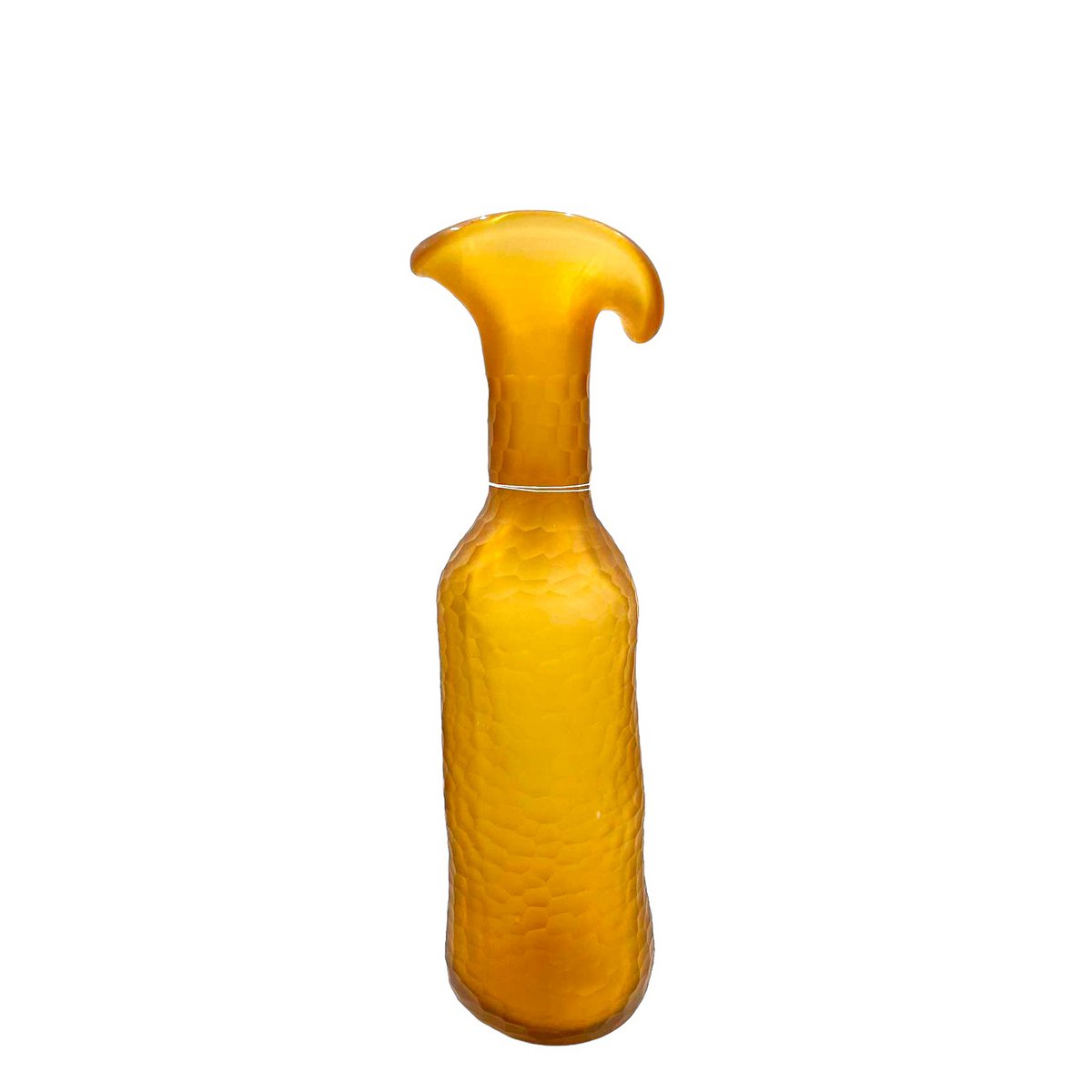 De ongebruikelijke vorm van deze vaas draagt bij aan het karakter en de charme van dit vintage vat. Er zijn geen andere soortgelijke vazen om mee te vergelijken, het dikke glas heeft opmerkelijk stand gehouden, maar vertoont wel wat vertroebeling.