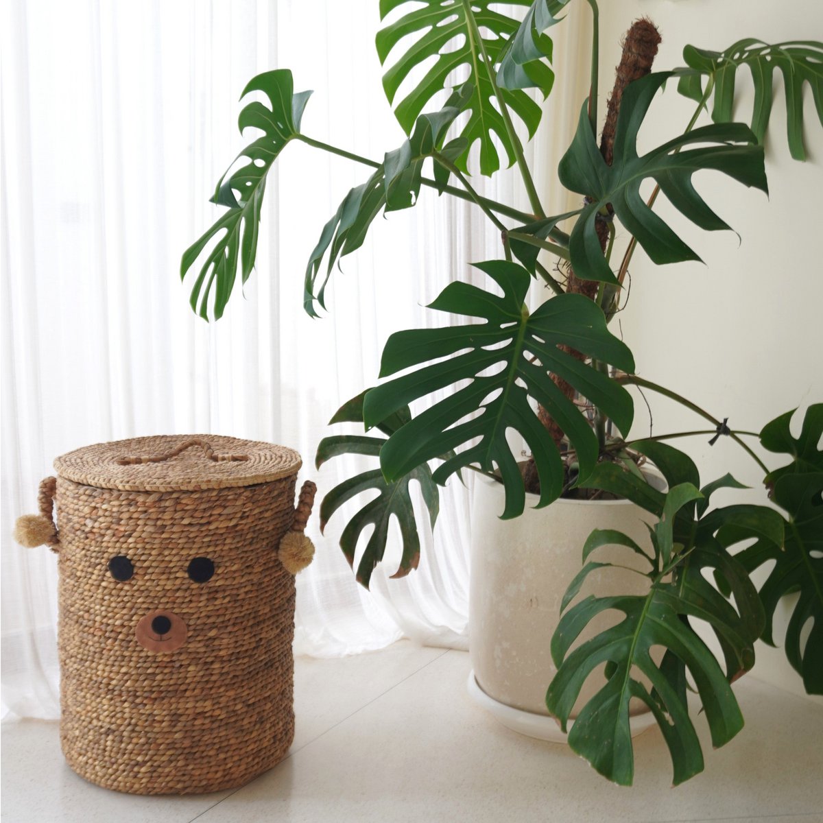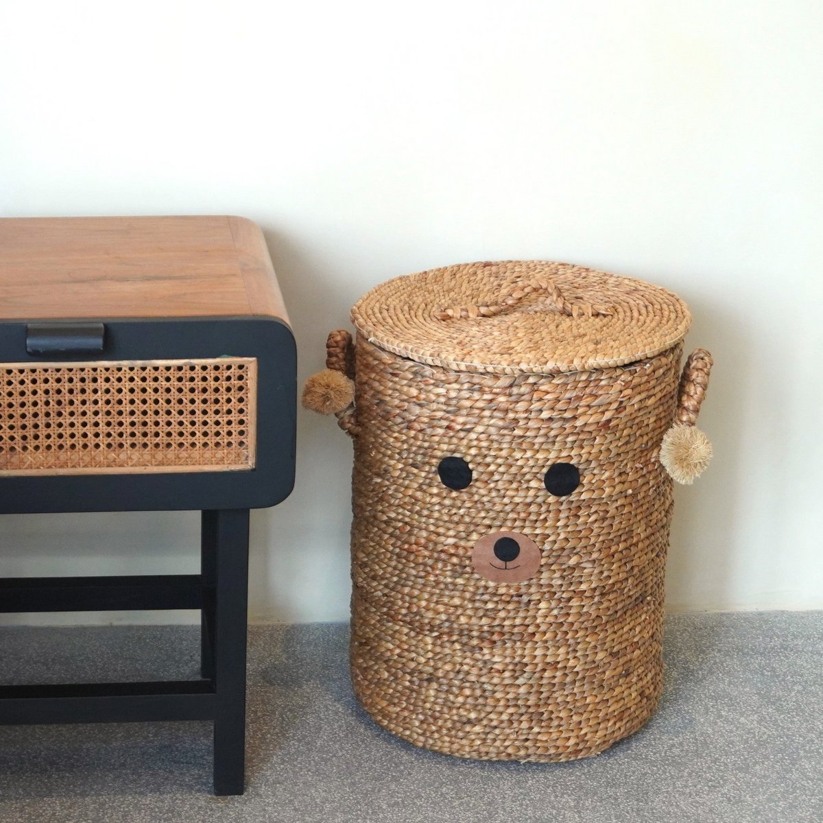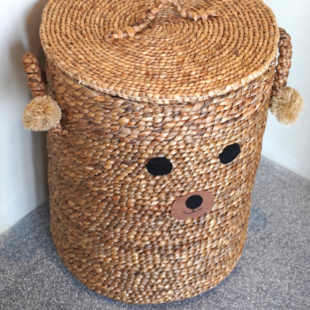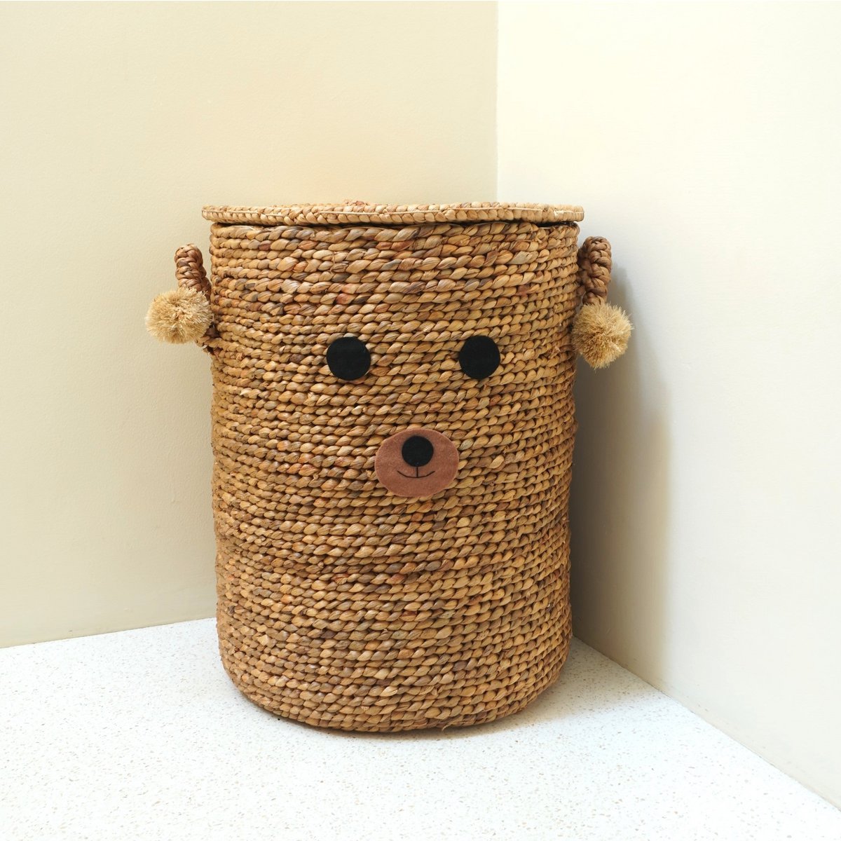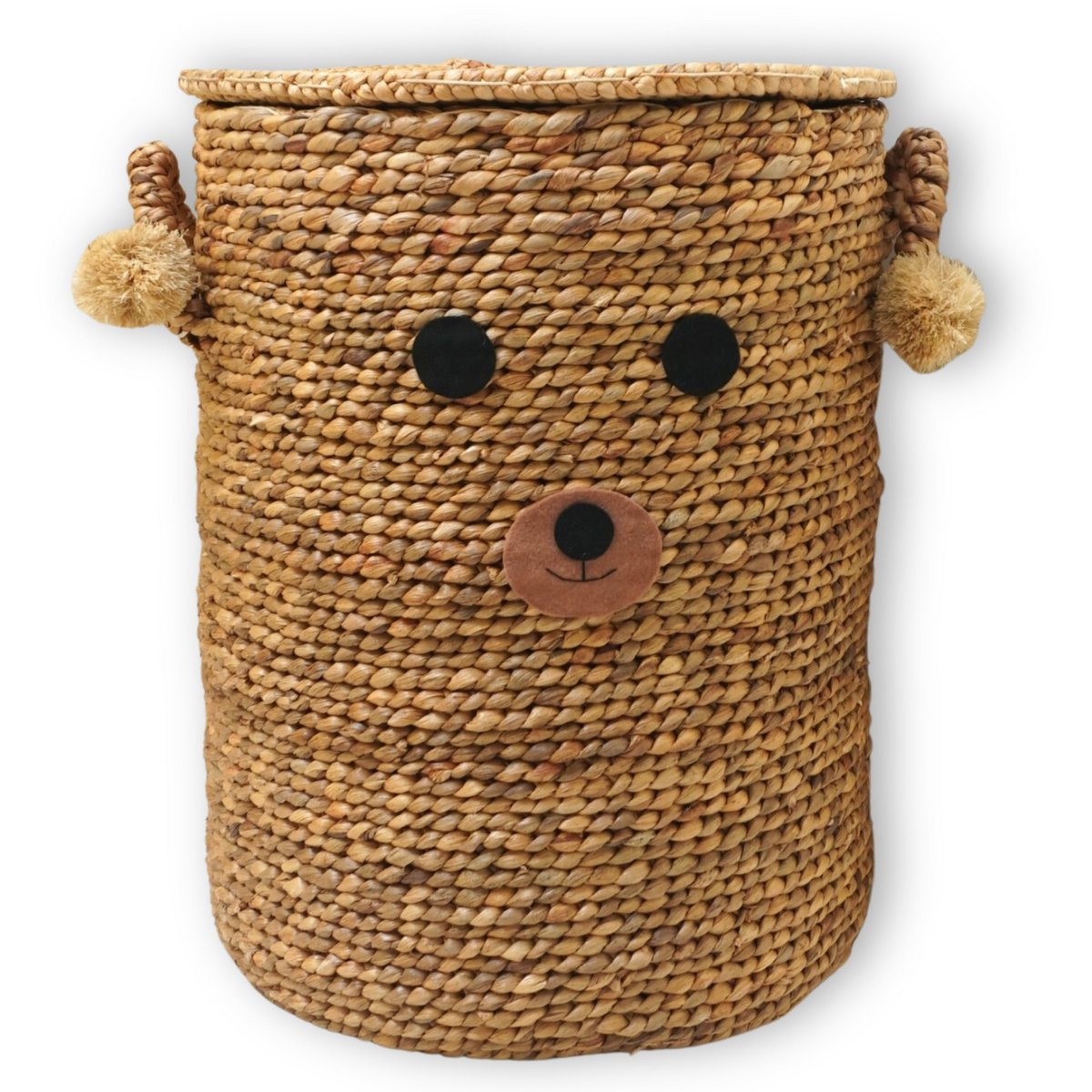 Wasmand voor kinderen met teddybeergezicht KIYOWO gemaakt van waterhyacint geweven mand met deksel