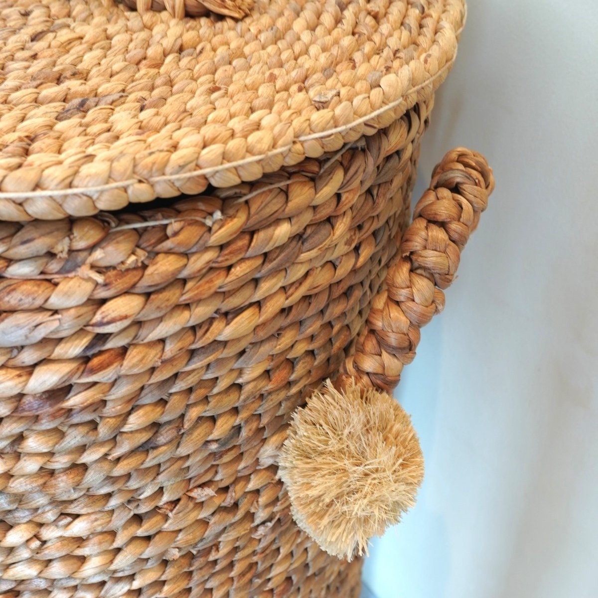 De waterhyacint is een tropische waterplant die groeit op rivieren en meren. Het komt eigenlijk uit Zuid-Amerika, maar werd ook geïntroduceerd in Zuidoost-Azië. Daar wordt het als een onkruid beschouwd omdat het zich ongelooflijk snel vermenigvuldigt en hele watermassa's kan bedekken met een tapijt van bladeren. Het daaruit voortvloeiende gebrek aan licht en zuurstof zorgt ervoor dat al het leven onder water afsterft. Daarom moeten de planten regelmatig worden verwijderd. Om de planten klaar te maken voor verdere verwerking worden de bladeren afgesneden en worden de dikke stengels drie tot zeven dagen in de zon gedroogd. Het resultaat is een overvloedige, duurzame grondstof voor veel vlechtwerk hier bij Soeji!