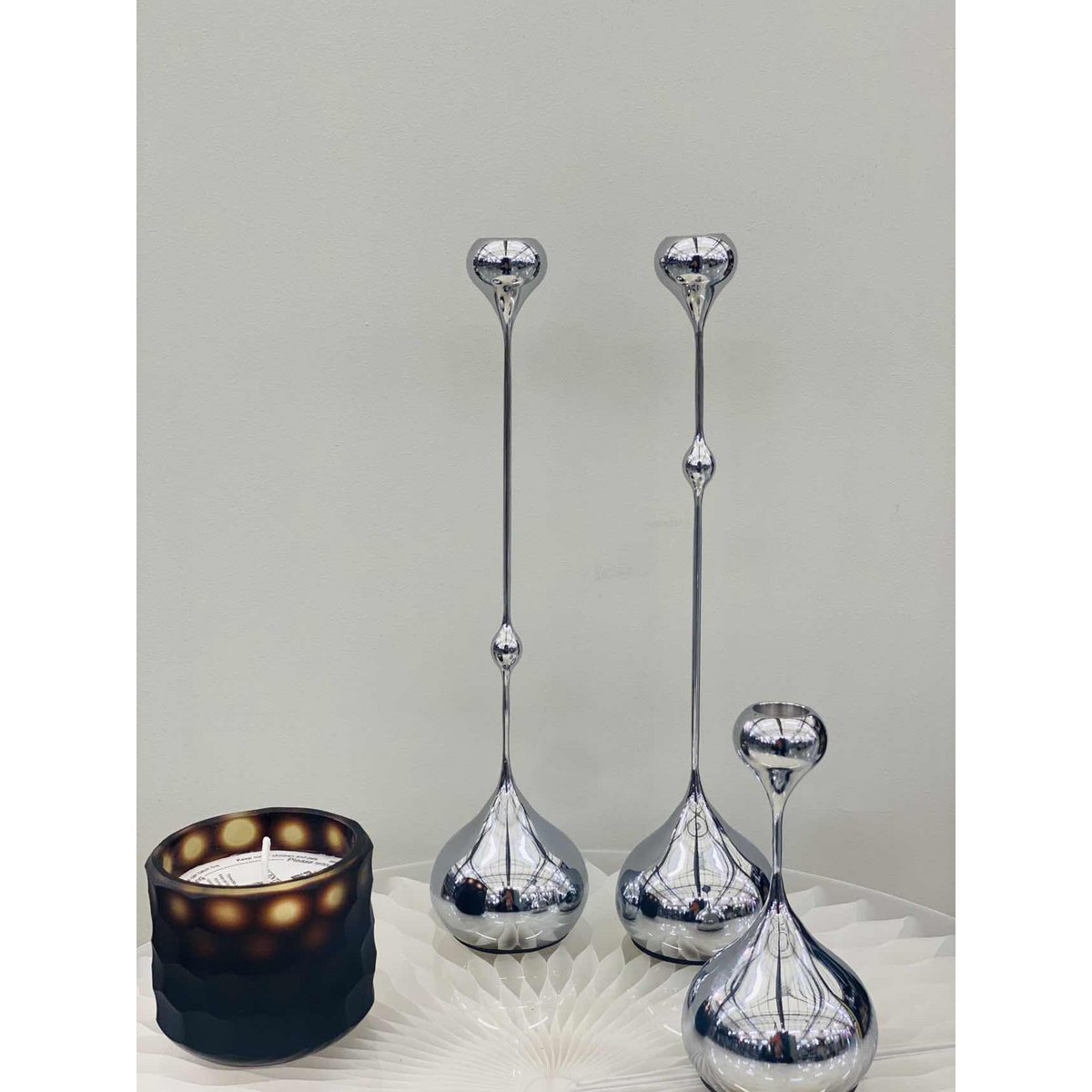 Deze kandelaars van massief hooggepolijst nikkel, ontdekt in China, voegen een sculpturale uitstraling toe aan de eettafel of schoorsteenmantel. Elk kwaliteitsstuk is handgemaakt in China. Afmetingen: H 34 cm x D 3,15 x W 7 cm inch