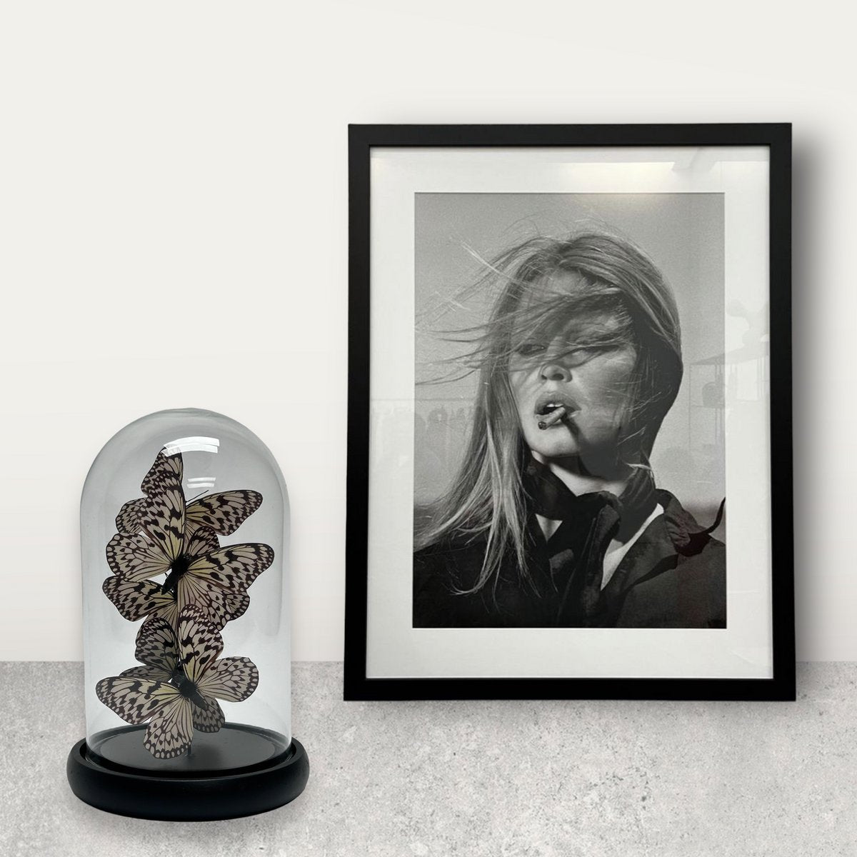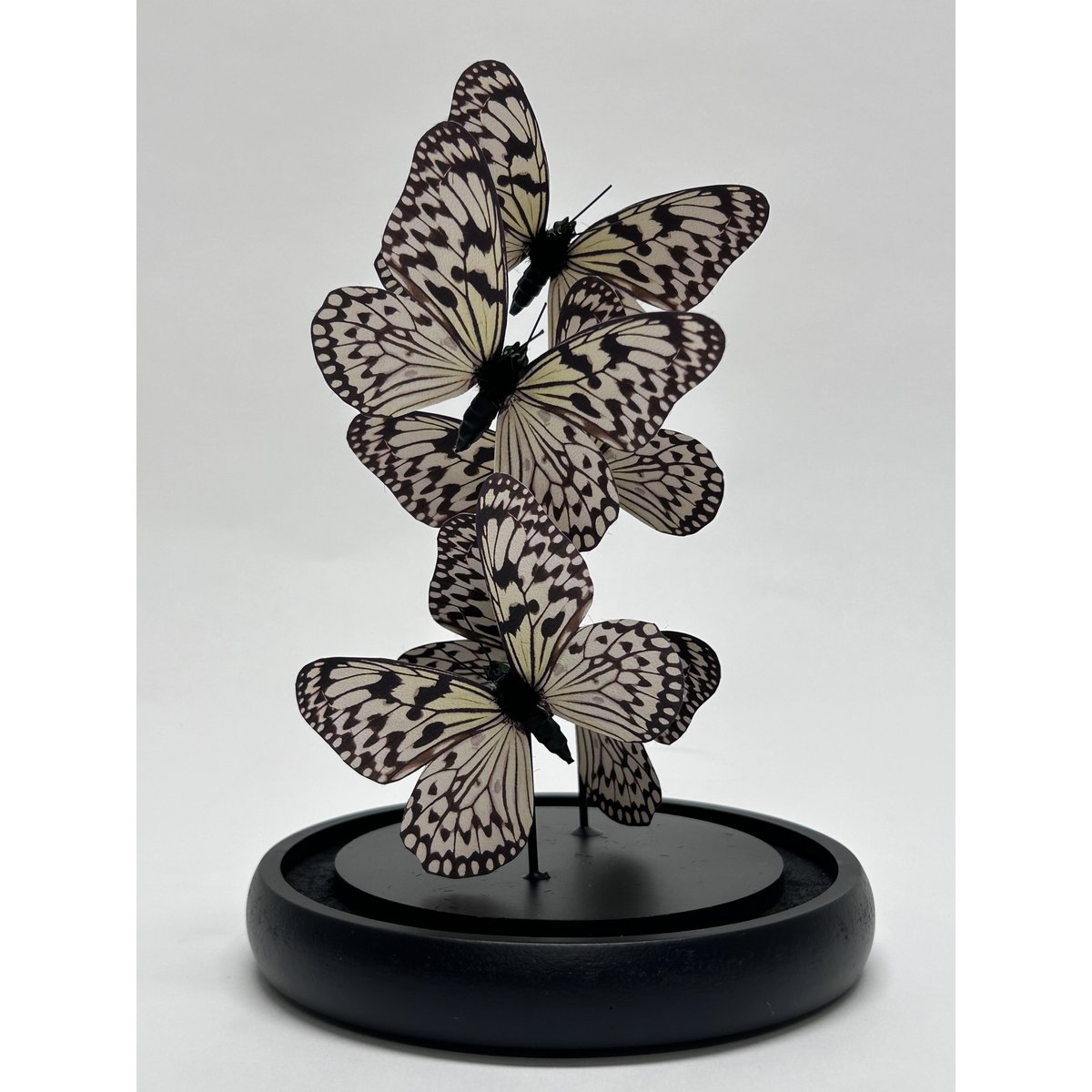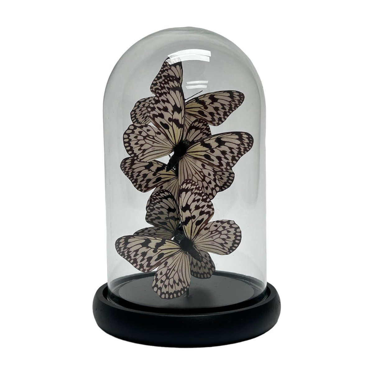 Breng de sereniteit van natuur in huis met onze elegante glazen stolp met vijf zorgvuldig nagemaakte vlinders van de soort Idea leuconoe obscura , ethisch vervaardigd uit zijde voor een levensechte weergave. Volledig met hand gemaakt en verfijnd in design, dit stijlvol item is de perfecte aanvulling voor elk type interieurdecoratie.